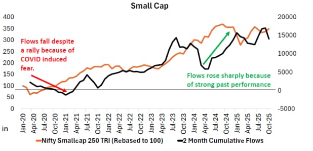 Flows into small-cap mutual funds rise sharply due to strong past performance, as investors chase higher returns. However, flows decline when recent returns flatline or turn negative. This was the case during the robust returns of 2023-2024.