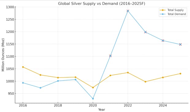 Silver Demand Continues to Outpace Supply (2016-2025)