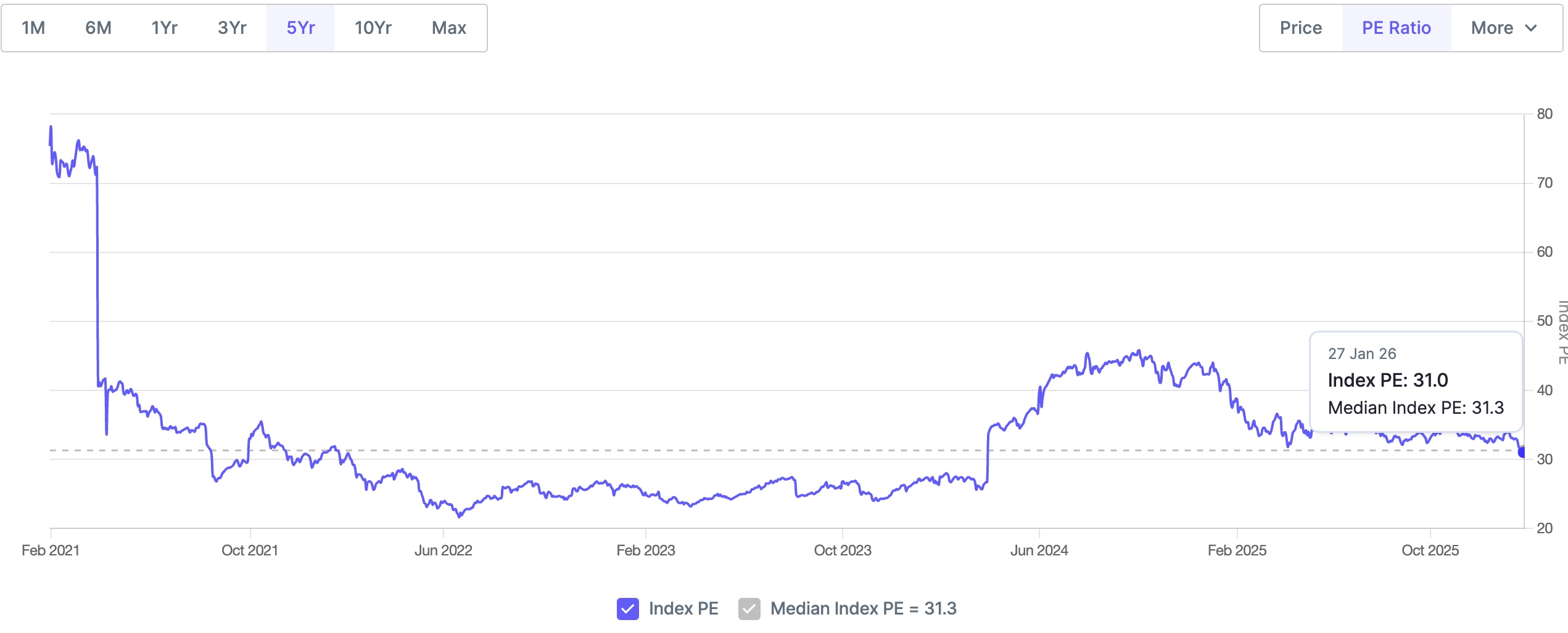 Valuation-wise, the price-to-equity (PE) ratio of the Nifty Midcap 150 index is currently near the 5-year median. This is much below the peak of 45 seen in 2024, when the midcaps were at their peak.