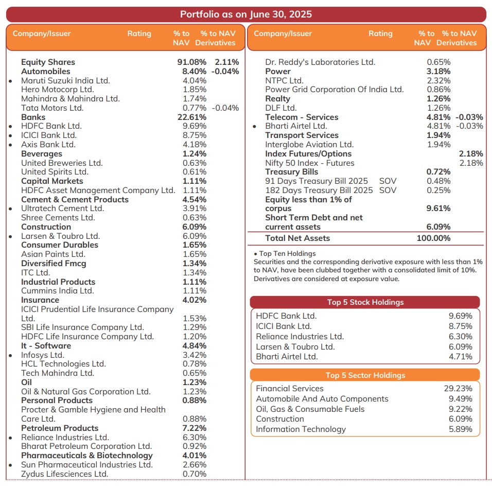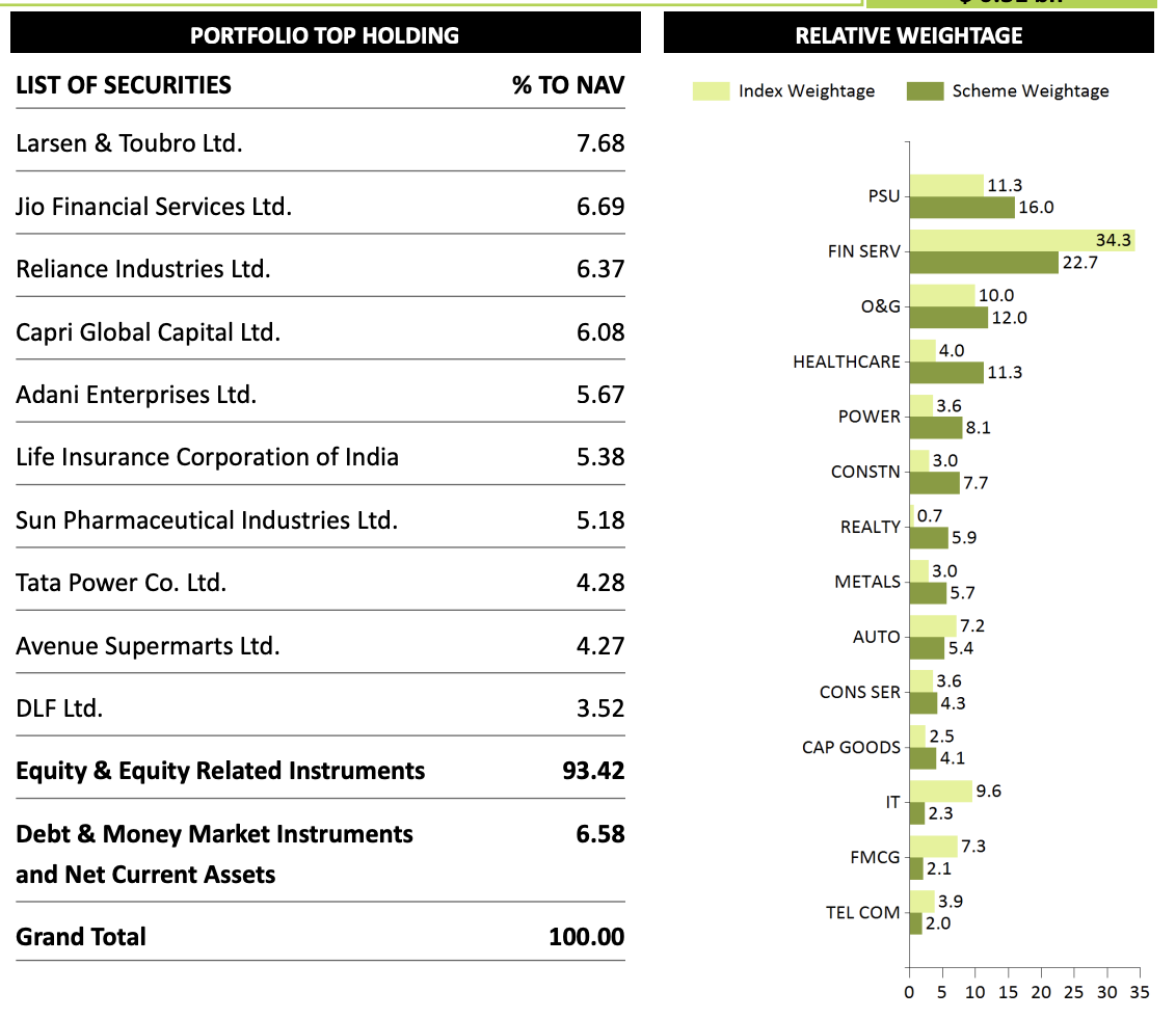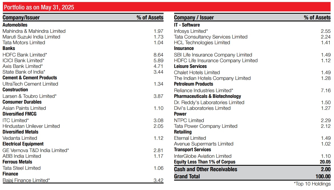 Its portfolio feels more traditional, a heavier tilt to financials, energy, and consumer staples. The top holdings include the usual private banks and Reliance, but the overall sector weights suggest a more benchmark-aware approach.
