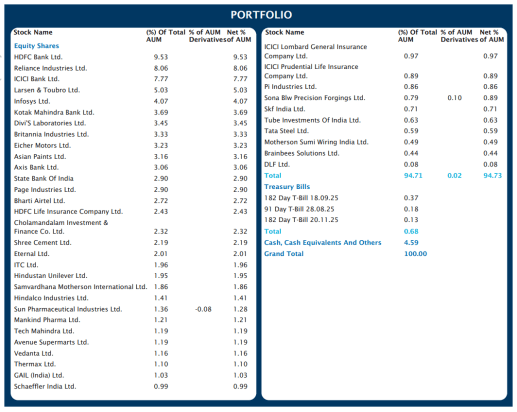 The fund appears to carry a wider lens combining traditional large cap allocations with exposure to emerging themes. It does not behave like an index tracker. It participates in the core but looks beyond it too. That mix may explain its performance during certain market cycles, especially those driven by newer sectors or underappreciated names.