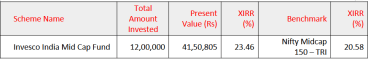 Invesco India Mid Cap Fund, in the last 10 years, has delivered an XIRR or SIP return of 23.46% compared to 20.58% by its benchmark, the Nifty Midcap 150 – TRI as of 25 August 2025.