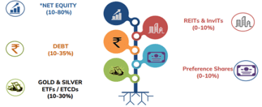 It invests in equities, debt securities, Exchange Traded Commodity Derivatives (ETCDs) like gold and silver, REITs, InvITs, and preference shares.