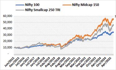 The divergence between midcaps and other categories has expanded in recent years, with the Nifty Midcap 150 TRI consistently outperforming largecap and smallcap indices, particularly since 2020.