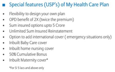 The My Health Care Plan product consists of mandatory coverages like In-patient hospitalization expenses, pre and post-hospitalization expenses, Modern Treatment Methods and Advancement in Technologies, Organ donor expenses, Ayurvedic and Homeopathic Hospitalization Cover, Maternity Package Expenses, Baby Care, Out-patient Treatment Expenses (OPD), Home Nursing Benefit, Sum Insured Reinstatement, Airlift Cover, and Cumulative Bonus, amongst others. Under the Maternity Package section, the plan covers maternity expenses for the insured member as well as the surrogate mother as well as the complications of Assisted Reproductive Procedures or Techniques.
