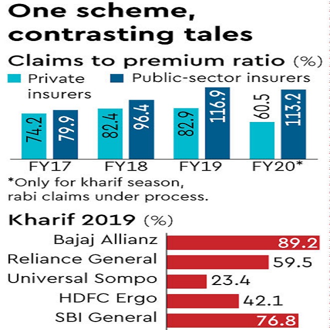 Some of the private insurers seem to have cut against the grain and found a lucrative business model under the Pradhan Mantri Fasal Bima Yojana (PMFBY), the government-supported crop insurance scheme. Claims to premium (CP) ratio of private insurers in kharif 2019 season stood at just 60%, and was as low as 23% in the case of one firm, implying their high profitability.