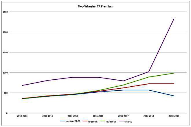 The above charts show respectively the increase in third party premium for the last six years for private cars as well as two-wheelers. It can easily be observed that TP rates for private cars have increased substantially by 20% in initial years whereas they saw a rise by 30% and 40% in subsequent years. On an average, private car vertical has seen an average increase of 29% for the third-party insurance premium. Similarly, two-wheeler vertical has seen an average of 23% across its segments over the last six years.