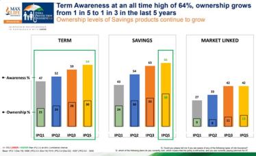 According to IPQ 5.0, with respite from health-related worries, urban India has begun reprioritizing investments in savings plans for life insurance showcasing sustained growth in ownership – up from 24% in IPQ 1.0. to 38% in IPQ 5.0, while term plan adoption rates have grown ~50% in 5 years.