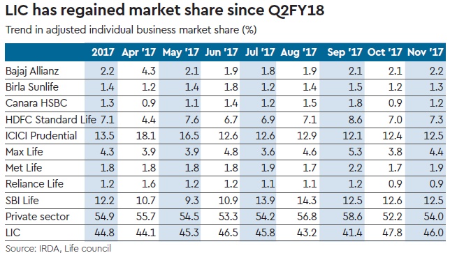 Private life Insurance companies reported another month (November, 2017) of 30% growth in individual APE translating into 35% growth during April-November 2017. With 23% growth at LIC, overall growth rate was high at 27% y-o-y. Most players remained strong except Max Life and ICICI Prudential Life, both up just about 10% — we don’t read much into this moderation. Private players’ broad focus on agency expansion remained through bancassurance and it has gained share for large players in the last quarter.