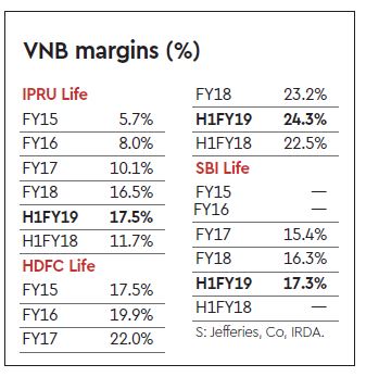 On H1FY19 EV, HDFC Life trades at 4.4x P/EV, IPRU at 2.4x & SBI Life at 2.9x. Stripping out EV, current prices imply growth value at 37x FY19 VNB for HDFC Life, 18x for IPRU and 21x for SBI Life.