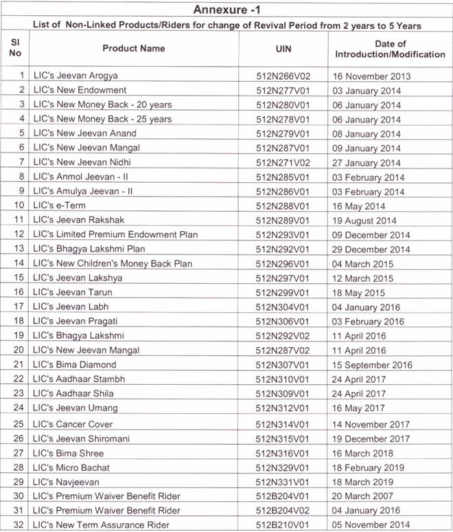 Following are the 32 products, in which, the LIC of India has extended the revival period to 5 years: