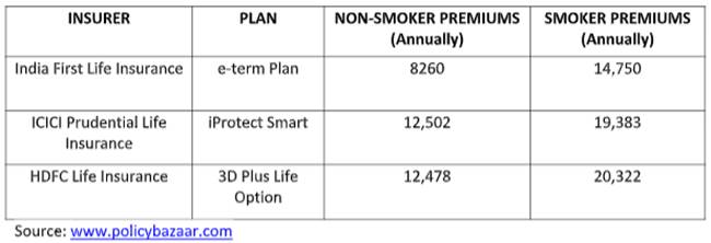 The table enclosed below compares the premiums of smoker’s vs non-smokers by three leading insurers providing term insurance of Rs 1 crore life cover for a 30-year-old and covering age till 70 years.