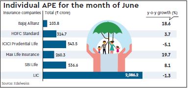 The life insurance industry reported flat premium growth in June as its individual annual premium equivalent (APE) stood at 4.1% year-on-year at Rs 4,733.2 crore. However, private players posted an individual APE growth of 8.9%, while Life Insurance Corporation of India (LIC) – the country’s largest insurer – achieved a 1.3% dip in growth, data from Edelweiss showed.