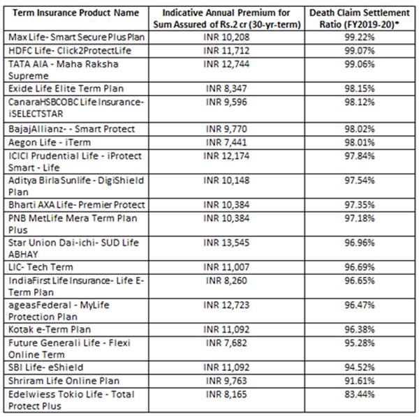 Disclaimer: Data pertains to term insurance cover of Rs 1 crore for a 30-year-old, salaried, non-smoker male (unmarried), residing in Bengaluru, earning Rs 5 lakh annually, for a 30-year term. The table is not exhaustive as it excludes companies for which data is not available on their website. Data as of 20 July 2021. *The insurers have been listed in descending order based on their death claim settlement ratios as per the IRDA Annual Report 2019-2020.