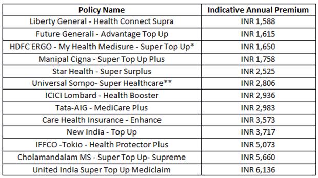 Annual Premiums For Super Top-Up Health Insurance Plans With Rs15L Coverage (Rs 5L Deductible)