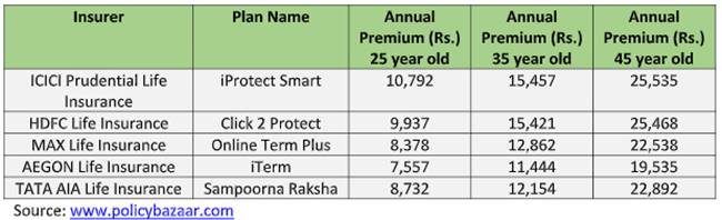 Below are the premium comparisons of Term insurance offered by 5 prominent insurers for 25-year-old, 35-year-old and 45-year-old males covering up to 70 years, residing in a metro city. The total sum assured is Rs 1 crore.