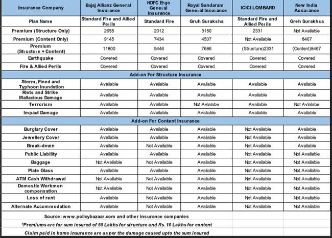 Here we are taking a look at some of the top home insurance plans and their premium for a sum insured of Rs 50 lakh for the structure of a home and Rs 10 lakh for its content.