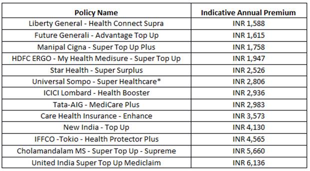 Annual Premiums For Super Top Up Health Insurance Plans With Rs 15L Coverage (Rs 5L Deductible)