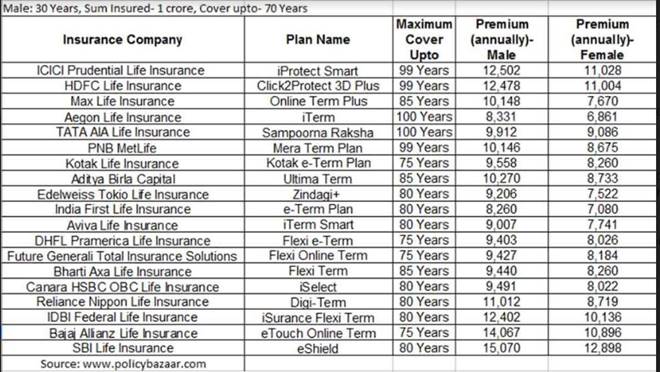 Below is the premium comparison of a 30-year-old male and female, non-smoker, residing in a metro city, for Rs 1-crore sum insured, and cover up to 70 years.