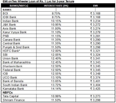 Before taking a two-wheeler loan, it is important to assess whether your existing financial situation can handle it without any stress. You must be able to repay the loan without delay and default. In the table below, compare two-wheeler loan interest rates and EMIs on a Rs 1-lakh loan for 3-year tenure. Choose your option based on your requirements.