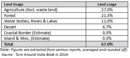 India is having about 16% share of the world population as against 2.6% share of land, causing land deficit. Hence, India must ensure productive and efficient usage of land for the nation’s prosperity. Total land in India is about 3.30 million square KM and its approximate usage and classification is mentioned below.