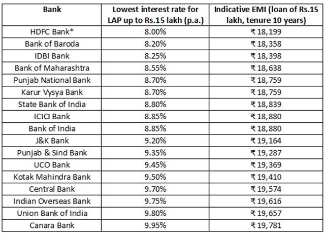 Disclaimer: Interest rates on Loan Against Residential Property (LAP) for all listed (BSE) public and private banks considered for data compilation. Banks for which data is not readily available on their website have not been considered. The data collected from respective banks websites as of 31 Aug 2021. The lowest interest rate offered by the banks offering such loans at starting interest rates lower than 10% p.a. on a loan of up to Rs 15 lakh is shown in the table. The EMI is calculated on the basis of the interest rate mentioned in the table for Rs 15 lakh loan with a tenure of 10 years (processing fee and other charges are assumed to be zero for EMI calculation). The interest rates mentioned in the table are indicative and may vary depending on the bank’s T&C. *HDFC Bank rack interest rate.