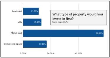 Magicbricks has observed a growing preference for plotted developments among first-time investors, who are drawn to their higher appreciation potential and long-term capital returns. According to a recent poll conducted by Magicbricks, 58% of respondents preferred investing in plots, followed by commercial spaces (17.1%).