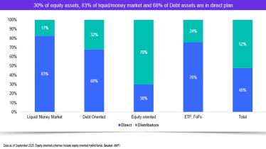 The impact of direct plans is most visible in debt and liquid mutual funds. About 83% of investments in liquid/money market funds come through direct channels, while 68% of investors invest directly in debt-oriented funds.