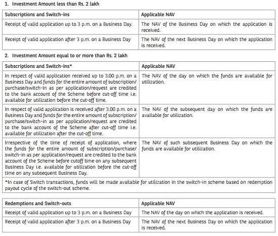 2. Funds for the entire amount of subscription/switch-ins as per the application are credited to the bank account of the scheme before the cut-off time i.e. 3 p.m.