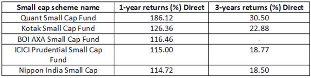 As shown in the table, these small-cap funds returned a whopping 114.7% to 186.1%, assuming a lump sum investment was made a year back. However, if you notice the 3-year annualised returns of these mid-cap funds, the returns come down to 18.5% to 30.5%. There are other small-cap funds whose 3-year annualised returns are much lower despite generating extremely high returns in the last one year.