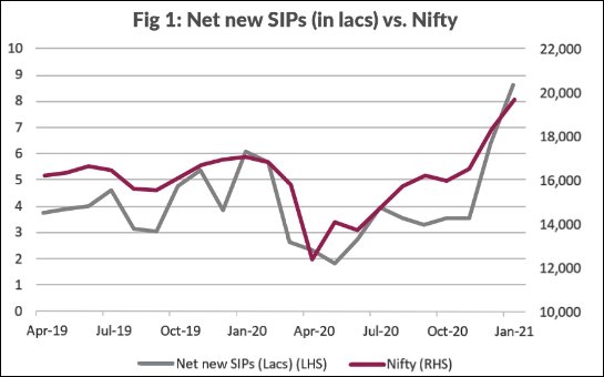 (Source: Amfi, NSE, Axis AMC analysis; Net new SIPs are calculated as the difference between the number of new SIPs registered and number of SIPs discontinued/ tenure completed)