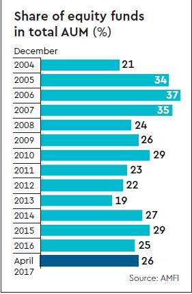 Equity assets under management (AUM) now constitute 26% of aggregate mutual fund AUM. A report by Deutsche Bank shows that on an average, equity AUM has been 23% of aggregate mutual fund AUM over the last 15 years. This was 37% in December 2006. “If the economic growth momentum revives and retail enthusiasm builds further, there is a likelihood of higher share of equity AUMs for mutual funds,” says Abhay Laijawala, analyst, Deutsche Bank.