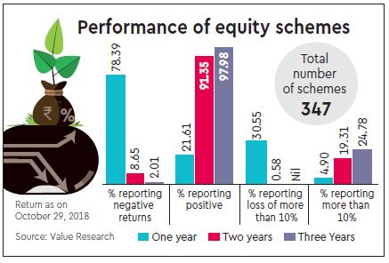 The returns are as on October 29, 2018. However if we look at the data of equity schemes for the two year and three years period then out of total 347 schemes, only 8.65% and 2.01% of the them have given negative returns.
