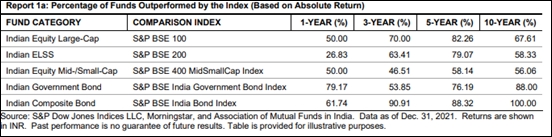 S&P Indices Versus Active Funds India Scorecard, studied the performance of three categories of actively managed equity funds with their respective benchmark indices over 1-, 3-, 5- and 10-year investment horizons ending in December 2021.