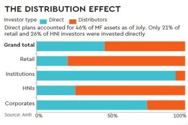 The regulator seems to be batting for direct plans, but the end beneficiaries have really been institutional investors. Overall, direct plans accounted for 46% of the industry AUM as of July, according to AMFI. Only 21% of retail and 26% of HNI investors invested in direct plans. On the contrary, it was close to 75% for corporates and over 90% for institutional investors.