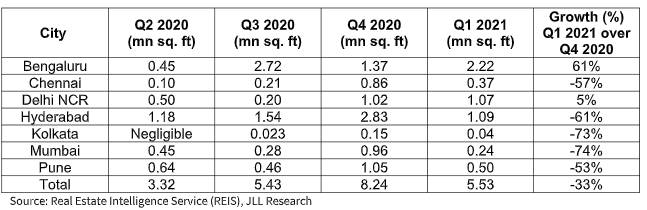 Bengaluru, Hyderabad and Delhi NCR accounted for nearly 80% of the net absorption during the quarter. Moreover, Bengaluru and Delhi NCR were the two markets which witnessed an increase in net absorption when compared to Q4 2020.