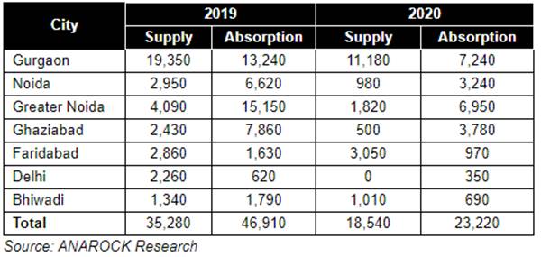 From a new launch perspective, the whole of NCR saw a total of about 18,540 units launched in 2020, of which Noida and Greater Noida collectively accounted for a mere 15% share or approx. 2,800 units. Gurgaon saw new supply of nearly 11,180 units during the year – denoting a significant 60% overall share.