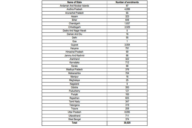 Uttar Pradesh witnessed the highest number of enrollments with 8,895 accounts under the scheme. Andhra Pradesh and Chhattisgarh are the states with second and third highest enrollments with 4,899 and 3,929 accounts opened, respectively. On the contrary, Dadra And Nagar Haveli, Nagaland and Manipur did not open more than 16 accounts.