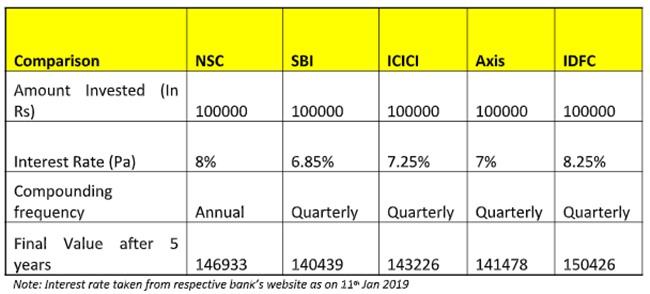 One major area of difference is the rate of interest associated with the products. In case of NSC, the interest rate is subject to change every quarter whereas the FD rates are changed periodically by banks basis policy/rate changes. NSC offers a common interest rate for all investors. FD interest rates, on the other hand, may vary from bank to bank. The difference between the rates offered by various banks can approximately go up to 100 basis points. Hence, when you pick a tax-saver FD, make sure you have run your research and compared options.