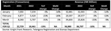 Greater Hyderabad saw a total of 18,461 sales registration of homes in Q1 2022, which was lower by 19% compared to same time last year. The total value of properties transacted in the first quarter is estimated to be Rs 86,797 million, according to Knight Frank India.