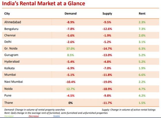* Pan-India rental demand (searches) across the 13 cities declined 3.9% QoQ but increased 29% YoY. Demand in Greater Noida (37%), Noida (12.7%) and Gurugram (8.5%) registered QoQ growth.