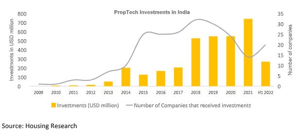 According to Housing.com, the private equity (PE) investment in PropTech firms increased by 5% to $270 million during January-June 2022 as compared to the year-ago period. Between 2009 and H1 of 2022, the PropTech industry in India received a total of $3.42 billion in private funding.