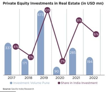Pune’s real estate sector saw an influx of $194 million in private equity investments during 2022. Pune’s abundance of talent, thriving IT industry, improved connectivity, and quality of living have created ample opportunities for investment, making it a prime destination for institutional investors. These investors have recognized the potential for growth in Pune and established a strong foothold in the city’s office market, according to the latest report by Savills India.