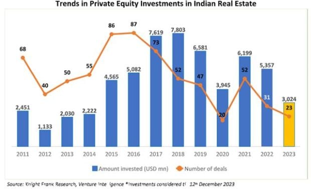 India’s real estate market received private equity (PE) investments of USD 3.0 billion from 23 deals in 2023 (January 01 – December12, 2023), as against USD 5.3 bn recorded in 2022, according to Knight Frank India.