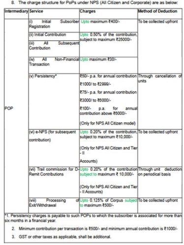 e-NPS transactions: Charges up to 0.20% of the contribution will be levied, subject to a maximum of Rs 10,000. This will be collected upfront. (Only for NPS All Citizen and Tier – II Accounts).