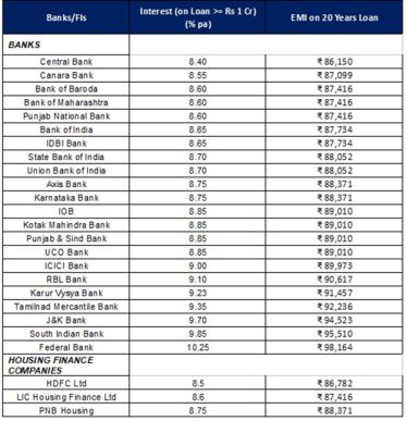 Finally, evaluate your creditworthiness, loan eligibility, interest rates, loan tenure, down payment requirements, EMIs, and associated charges before signing the loan agreement. By conducting thorough research and taking into account these essential aspects, you can embark on your homeownership journey with confidence and financial stability. The table below compares the interest rates and EMIs for a loan amount of Rs 1 crore for 20 years. You can compare and choose the most suitable based on your requirements.