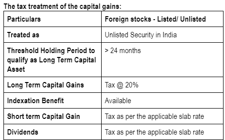 First and foremost, it is pertinent to note that the foreign stocks are treated at par with unlisted equity shares in India for the purpose of taxation. Thus, if such foreign stocks are held for more than 24 months, the gains derived from their sale would be categorized as long term, otherwise short term in nature.