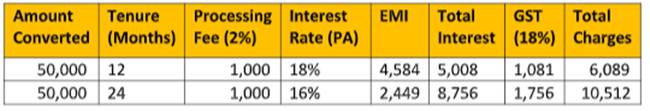Processing fee – It depends upon your card issuer and as few issuers don’t charge any processing fees while some may levy an upfront loan processing usually up to 3 per cent of the amount of your bill (converted into EMIs) or a fixed sum.