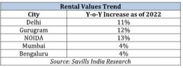 * Delhi witnessed an overall increase of 11% in rental values in 2022.