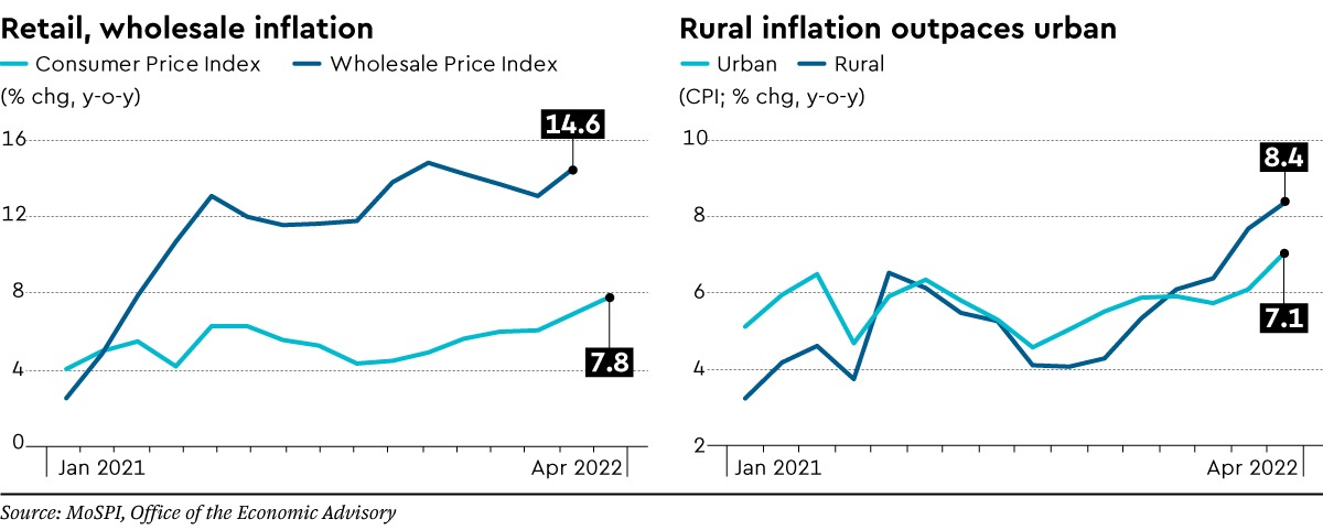 Retail inflation galloped to an eight-year high of 7.8% in April, much higher than the Reserve Bank of India’s outer target of 6%, driven by a spike in food prices which have nearly 46% weight in the consumer price index. Among food items, prices of vegetables and edible oils rose the fastest. Food inflation is mainly driven by rising costs of production, surging international crop prices and extreme weather-related disruptions. While vegetable prices fluctuate seasonally, the edible oil prices are likely to face inflationary pressure till domestic production rises.